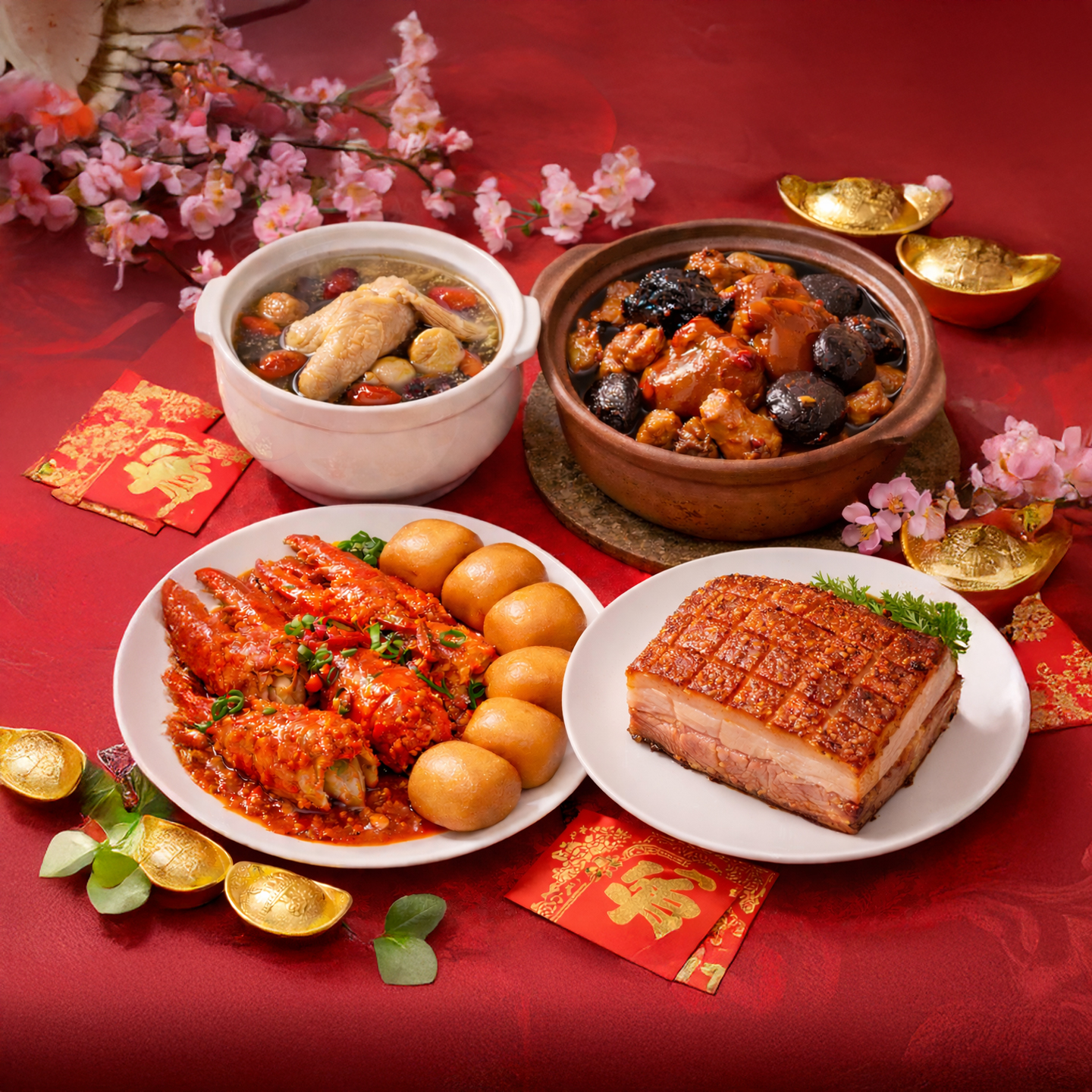 Begin with crustaceans on ice, featuring snow crab and Maine lobster, followed by a comforting double-boiled Hokkaido Dried Scallop Chicken Ginseng Soup. Savour Lunar New Year favourites such as Fatt Choy Pork Trotter with Korean Dried Oyster, and Lobster Claw in Chilli Crab Sauce. Enjoy live stations including Laksa with Slipper Lobster and Oyster, and a carving station serving Roasted Australian Ribeye. End on a sweet note with festive goodies, chocolate fondue, and a DIY Bingsu station with assorted toppings, and more!