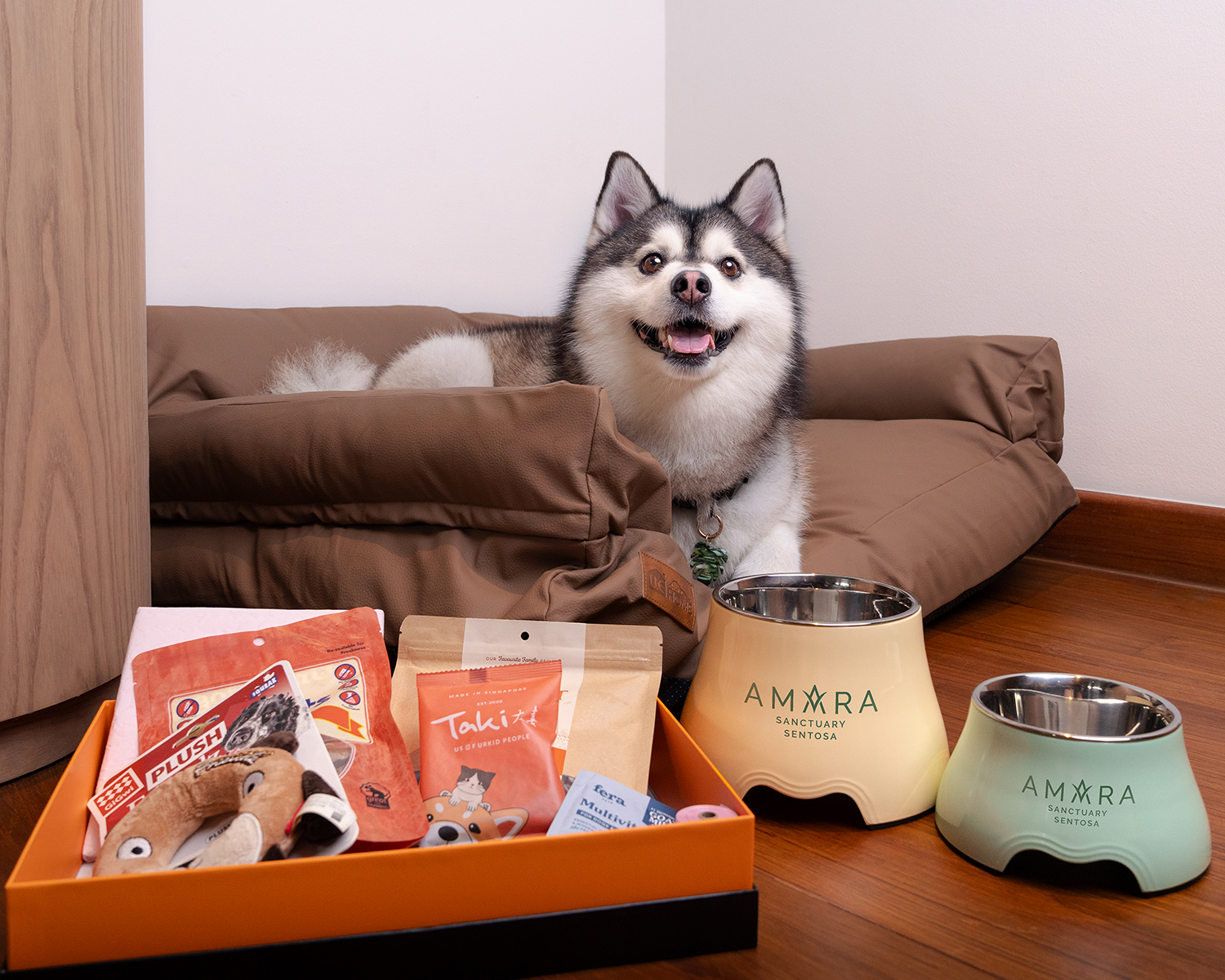 - Furkid stay amenities include a large bed and 2 pet bowls for food and water.